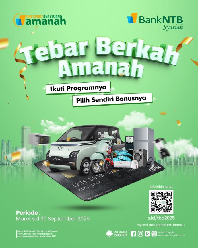 Mataram (Inside Lombok) – Bank NTB Syariah meluncurkan Program Tebar Berkah Amanah 2025. Dengan membuka rekening atau top up dana di tabungan iB Amanah/Giro iB Amanah akad mudharabah di Bank NTB Syariah, Anda dapat memilih sendiri hadiahnya.