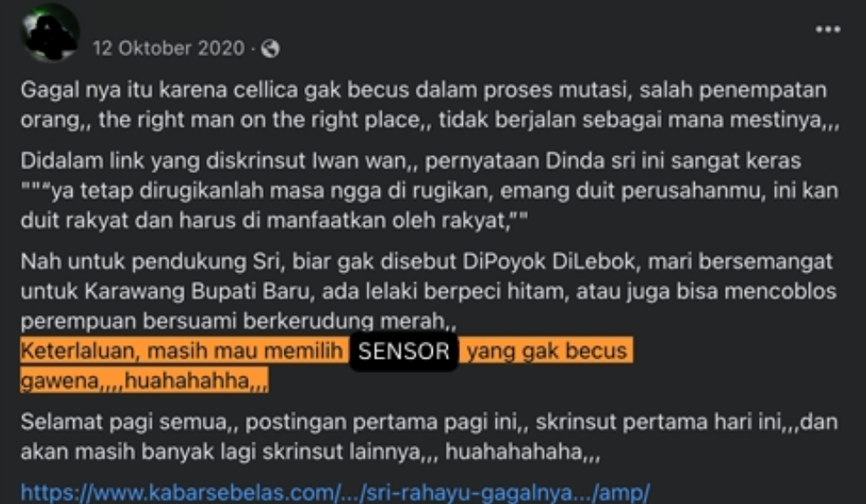 Contoh lain yang menarget kandidat perempuan, dikutip dari riset ICW pada 2018, kinerja Cellica sebagai Bupati Karawang dikaitkan dengan kehidupan pribadi. Kemampuan memimpinnya kerap dipertanyakan lantaran dikaitkan dengan “kegagalannya” mempertahankan pernikahan. Pada Pilkada Karawang 2020, beredar disinformasi dan kampanye hitam yang menyerang kehidupan pribadinya.