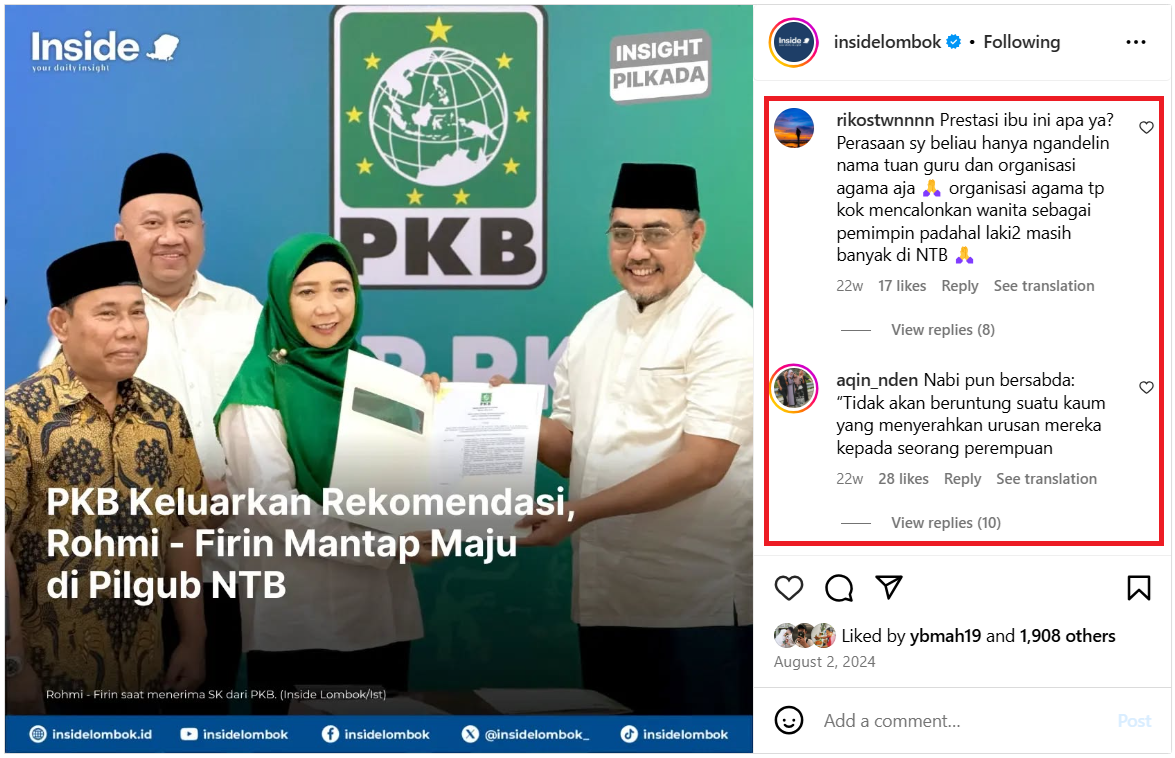 Adapun selama periode Pemilu 2024 di NTB, dis/misnformasi salah satunya bisa dilihat melalui konten yang berisi serangan ke calon gubernur nomor urut 1, Sitti Rohmi Djalillah. Dalam konten tersebut, Rohmi dinarasikan sebagai kandidat yang tidak pantas menjadi pemimpin lantaran dirinya perempuan. Narasi penolakan atas majunya Rohmi sebagai calon gubernur di Pilkada NTB itu seringkali menyitir hadis Nabi Muhammad SAW yang berbunyi “Tidak akan pernah makmur suatu kaum yang mengangkat seorang wanita sebagai pemimpin mereka,” (Hossain 1987:214).