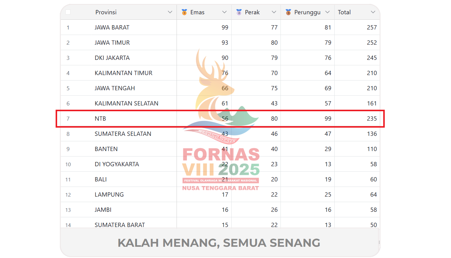 Mataram (Inside Lombok) – Sebagai tuan rumah Festival Olahraga Masyarakat Nasional (Fornas) VIII 2025, Provinsi NTB berada di posisi ketujuh dengan perolehan 234 medali. Rinciannya, berdasarkan data resmi di www.fornasviiintb.com, hingga penutupan event nasional ini NTB memperoleh 56 medali emas, 80 medali perak dan 98 medali perunggu.