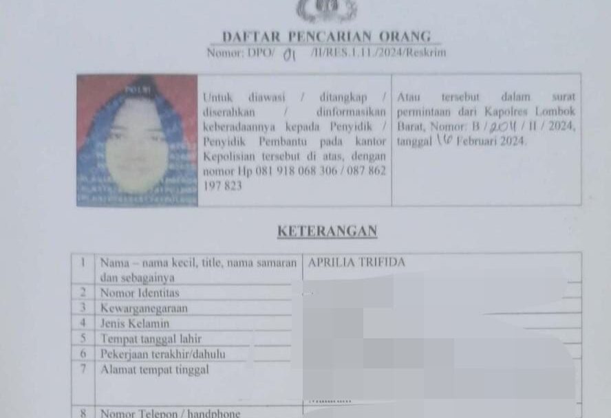Sebelumnya, Satreskrim Polres Lobar telah menerbitkan DPO terhadap terduga pelaku Aprilia pada 5 Februari 2024 lalu, usai mangkir dari panggilan penyidik untuk melaksanakan pemeriksaan. Penerbitan itu dilakukan karena yang bersangkutan tidak kooperatif.