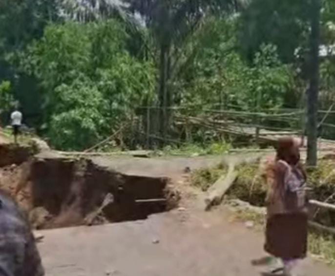 “Ini jalan utama masyarakat. Anak-anak sekarang hanya bisa lewat jalan setapak yang tersisa dan sebagian warga bahkan terpaksa membangun jembatan darurat dari bahan seadanya supaya akses bisa tetap lancar,” ujarnya.