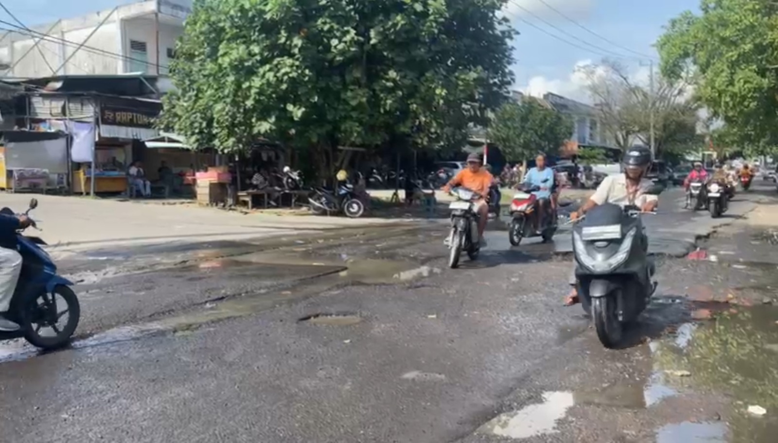 Lombok Tengah (Inside Lombok) – Ruas jalan di depan Pasar Renteng, Kabupaten Lombok Tengah (Loteng) rusak parah. Kondisi aspal berlubang dan luapan air dari drainase yang tersumbat semakin memperparah kondisi jalan, dan tak jarang membahayakan pengendara. Padahal ruas jalan itu menjadi pusat keramaian dan ekonomi di Loteng.