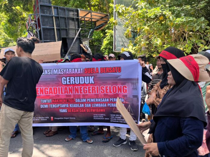 Lombok Timur (Inside Lombok) – Puluhan warga yang tergabung dalam Aliansi Masyarakat Suela Bersatu menggelar demonstrasi di depan Pengadilan Negeri (PN) Selong, Lombok Timur, menuntut transparansi dan keadilan dalam proses hukum sengketa tanah yang melibatkan 12 warga sebagai tergugat. Massa menilai terdapat sejumlah kejanggalan dalam persidangan kasus tersebut.