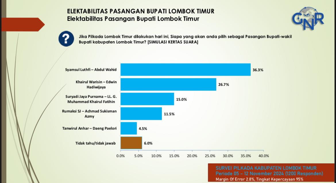 Hasil survei yang dilakukan oleh GNR tersebut menempatkan pasangan H. Syamsul Lutfi – Abdul Wahid pada posisi pertama dengan 36,3 persen, selanjutnya Khairul Warisin – Edwin Hadiwijaya 26,7 persen, Suryadi Jaya Purnama – LL Gede M Khairul Fatihin 15,0 persen, Rumaksi – Achmad Sukisman Azmy 11,5 persen, dan posisi elektabilitas paling buncit yakni paslon Tanwirul Anhar – H. Daeng Paelori 4,5 persen. Sementara yang tidak jawab dan tidak tahu (TJ/TT) mencapai 6,0 persen.