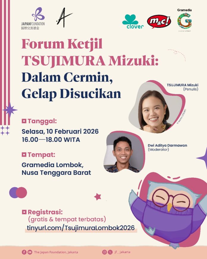 Mataram (Inside Lombok) — Japan Foundation dan Komunitas Akarpohon berkolaborasi dalam menghadirkan penulis Jepang TSUJIMURA Mizuki ke Lombok pada 8–11 Februari 2026. Penulis novel populer Kastel Terpencil di Dalam Cermin itu dijadwalkan bertemu langsung dengan pembaca dan pegiat literasi di daerah melalui forum diskusi dan kunjungan ke sekolah.