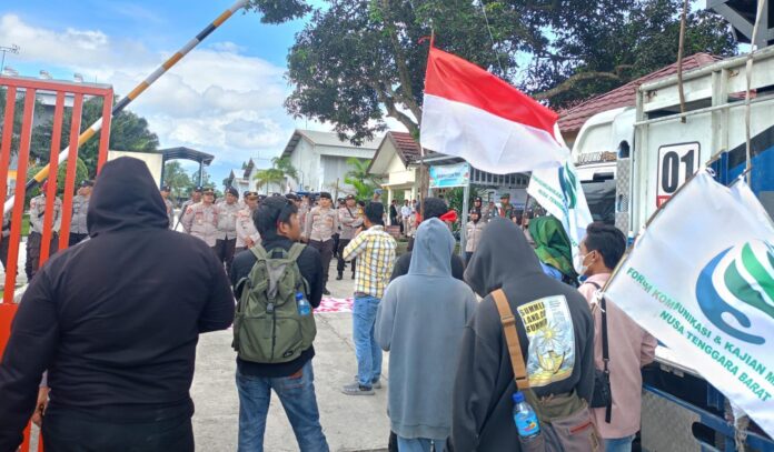 Lombok Timur (Inside Lombok) – Forum Kajian dan Komunikasi Masyarakat (FKKM) menggelar aksi unjuk rasa di depan Kantor Badan Urusan Logistik (Bulog) Cabang Lombok Timur di Sikur, Senin (22/12). Massa memprotes dugaan keterlibatan oknum pimpinan Bulog dalam kasus pengoplosan beras program Stabilisasi Pasokan dan Harga Pangan (SPHP).