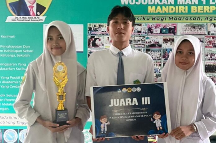 Lombok Timur (Inside Lombok) – Tiga siswa MAN 1 Lombok Timur (Lotim) meraih juara ketiga dalam Lomba Skill Lab Kimia tingkat Nusa Tenggara Barat (NTB) tahun 2025. Prestasi tersebut menunjukkan bahwa bersekolah di madrasah tidak menjadi penghalang bagi siswa untuk berprestasi di bidang akademik maupun non-akademik.