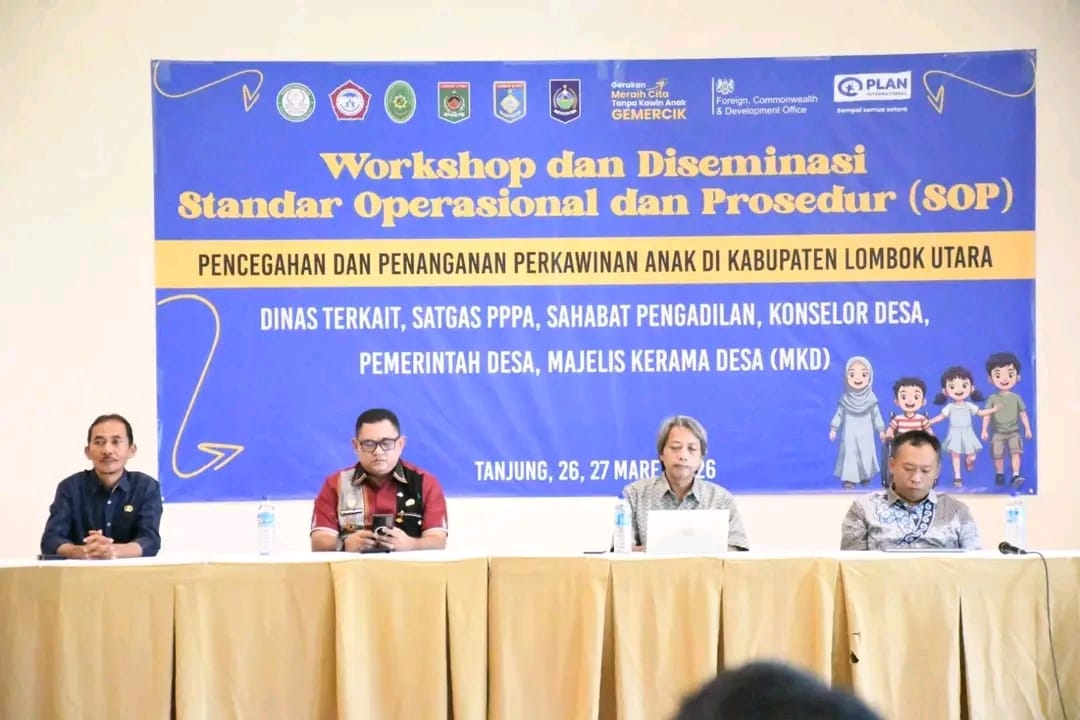 Lombok Utara (Inside Lombok) – Pemerintah Kabupaten Lombok Utara (KLU) memperkuat upaya perlindungan anak melalui penyusunan dan diseminasi Standar Operasional Prosedur (SOP) pencegahan perkawinan anak yang terintegrasi. SOP tersebut disosialisasikan melalui workshop yang digelar Dinas Sosial, Perlindungan Perempuan, dan Anak (Dinsos PPA) KLU bekerja sama dengan Plan Indonesia, Jumat (27/3/2026).