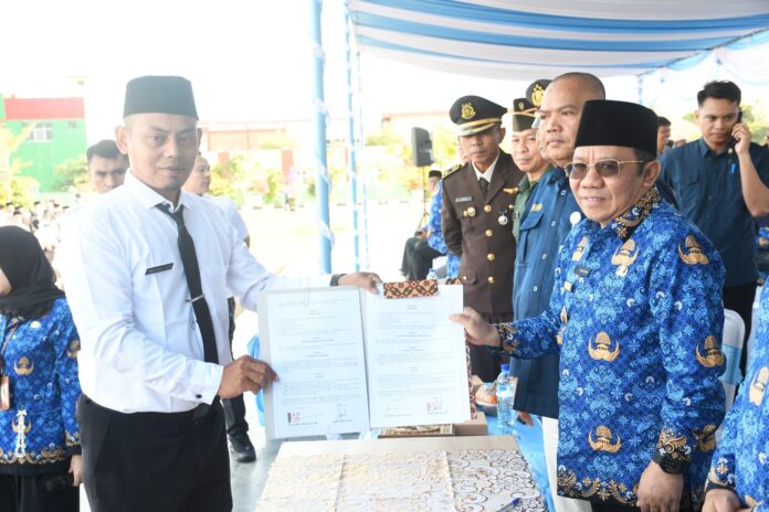 Lombok Utara (Inside Lombok) – Pemerintah Kabupaten Lombok Utara (KLU) menyerahkan Surat Keputusan (SK) pengangkatan Calon Pegawai Negeri Sipil (CPNS) dan Pegawai Pemerintah dengan Perjanjian Kerja (PPPK) formasi tahun 2024. Sebanyak 923 orang CPNS dan PPPK menerima SK tersebut dengan rincian, 56 CPNS dan 867 PPPK.