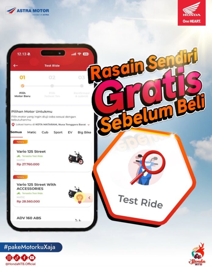 Mataram (Inside Lombok) – Memberikan kemudahan sekaligus pengalaman terbaik bagi konsumen, Astra Motor menghadirkan fitur Test Ride melalui aplikasi Motorku X. Lewat fitur ini, konsumen dapat merasakan langsung sensasi berkendara menggunakan sepeda motor Honda impiannya secara gratis sebelum memutuskan untuk membeli. Program ini menjadi solusi tepat bagi masyarakat yang masih galau menentukan pilihan sepeda motor, terlebih menjelang momen mudik dan Hari Raya Idul Fitri.