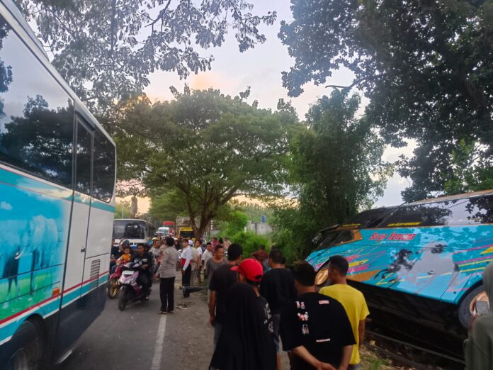 Lombok Timur (Inside Lombok) – Kecelakaan tunggal kembali terjadi di Desa Pringgabaya, Kecamatan Pringgabaya, Kabupaten Lombok Timur (Lotim). Sebuah bus yang ditumpangi oleh 32 orang hilang kendali saat menghindari pengemudi sepeda motor yang ada di depannya.