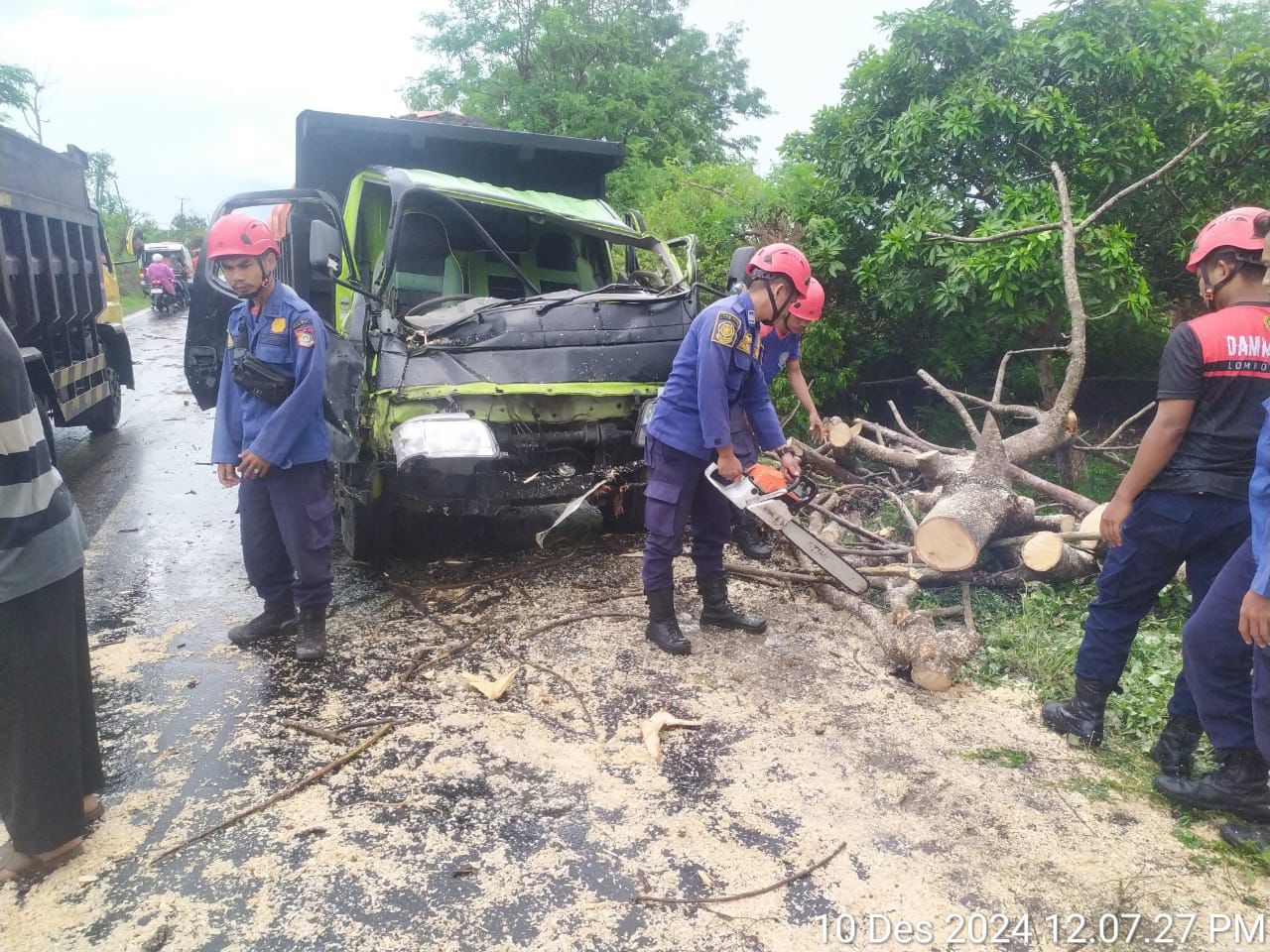Lombok Timur (Inside Lombok) – Sebuah insiden terjadi di Jalan Raya Labuhan Haji-Keruak tepatnya di depan Toko Elektronik Kwangwae, Dusun Kwangwae, Desa Menceh, Kecamatan Sakra Timur, Lombok Timur (Lotim) . Sebuah pohon jenis Banten tumbang akibat hujan lebat disertai angin kencang, menimpa satu unit dump truck yang tengah melintas.